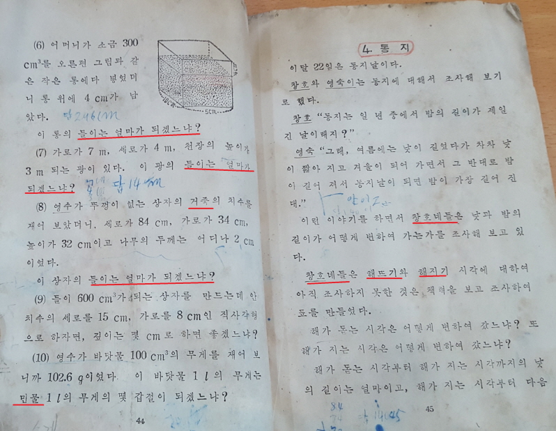 44쪽 여섯째 줄, 여덟째 줄과 아홉째 줄에 걸쳐 나오며 열넷째 줄에도 되풀이해서 나오는 “들이는 얼마가 되겠느냐?”는 물음이 새롭게 보입니다. 요즘 배움책에서는 “들이는 몇 mL입니까?”로 묻기 때문입니다. 어느 한 쪽이 좋고 나쁘다는 것이 아니고 물음을 다르게 할 수 있다는 것을 알려 주는 것 같아 저는 좋았습니다.