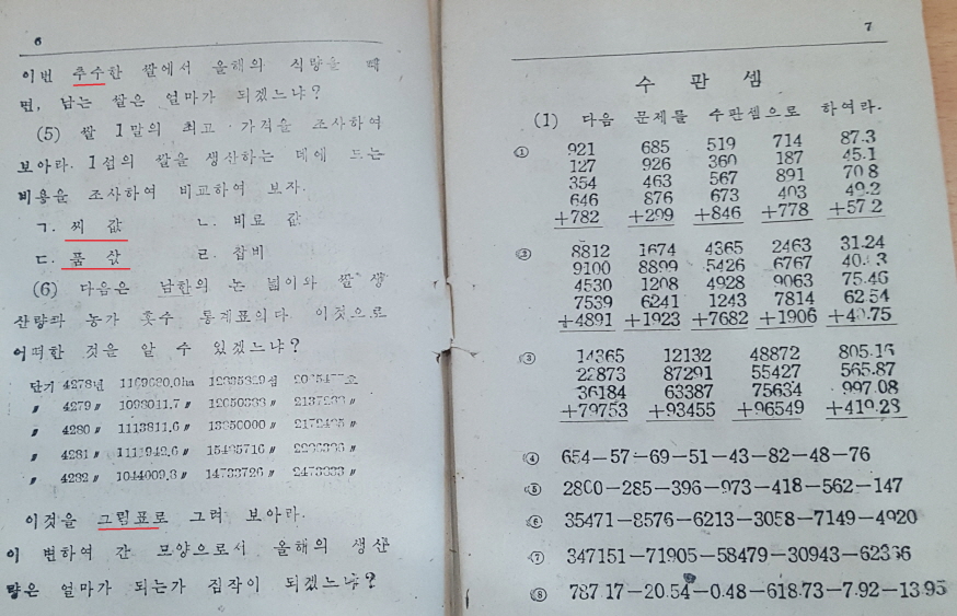 오늘은 4284해(1951년) 펴낸 ‘셈본 6-1’의 6쪽, 7쪽에서 캐낸 토박이말을 보여드립니다.
