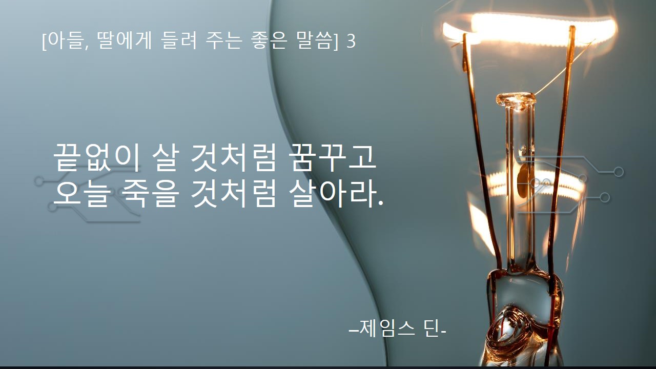 오늘 들려 줄 좋은 말씀은 그제 마실을 나가서 들었던 말 가운데 하나인데, "끝없이 살 것처럼 꿈꾸고, 오늘 죽을 것처럼 살아라."야. 이 말은 제임스 딘이라는 분이 남긴 말이라고 해. 이 말은 사람들로 하여금 '언제 어떻게 될지도 모르는데 힘들게 살지 않아도 돼', 또는 '좋은 게 좋은 거지' 또는 하루하루 편하게 살다보면 어떻게든 되겠지.' 라고 생각하며 지내는 건 아닌지 돌아보게 하는 말이라고 생각해.