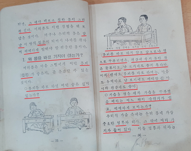 이어서 나오는 “몸씨를 바로 하면 어떤 좋은 점이 있는가?”도 그렇고 36쪽 그림 밑에 나오는 “우리는 어떤 몸씨를 가지는 것이 좋은가?”를 비롯해 그 아래 이어지는 풀이에서 ‘건강’, ‘물론’, ‘반대’, ‘유쾌’를 빼면 모두 토박이말로 쉽게 풀어 써서 좋았습니다.