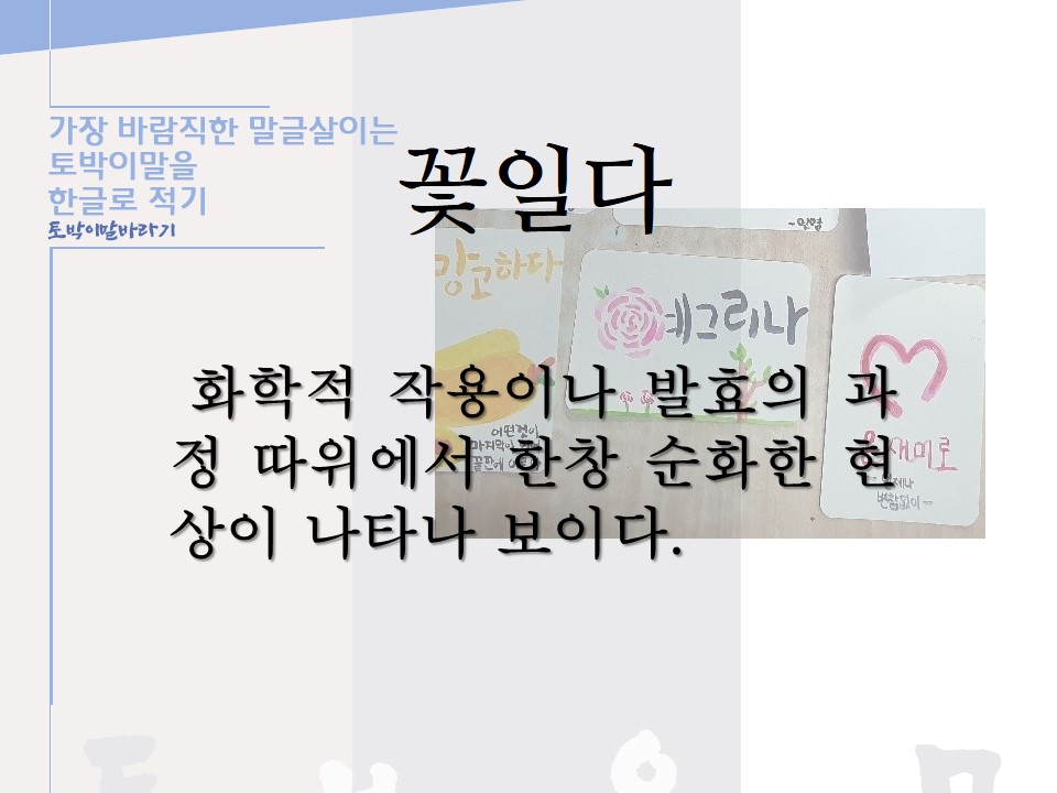 오늘 알려드릴 토박이말은 '꽃일다'입니다. 이 말을 말집(사전)에서는 '화학적 작용이나 발효의 과정 따위에서 한창 순화한 현상이 나타나 보이다'라고 풀이를 하고 있습니다. 이것만 봐도 무슨 뜻인지 어림은 할 수 있겠는데 똑똑히 알기 어렵지 싶습니다. 그래서 제 나름대로 다시 풀이를 해 보았습니다.
