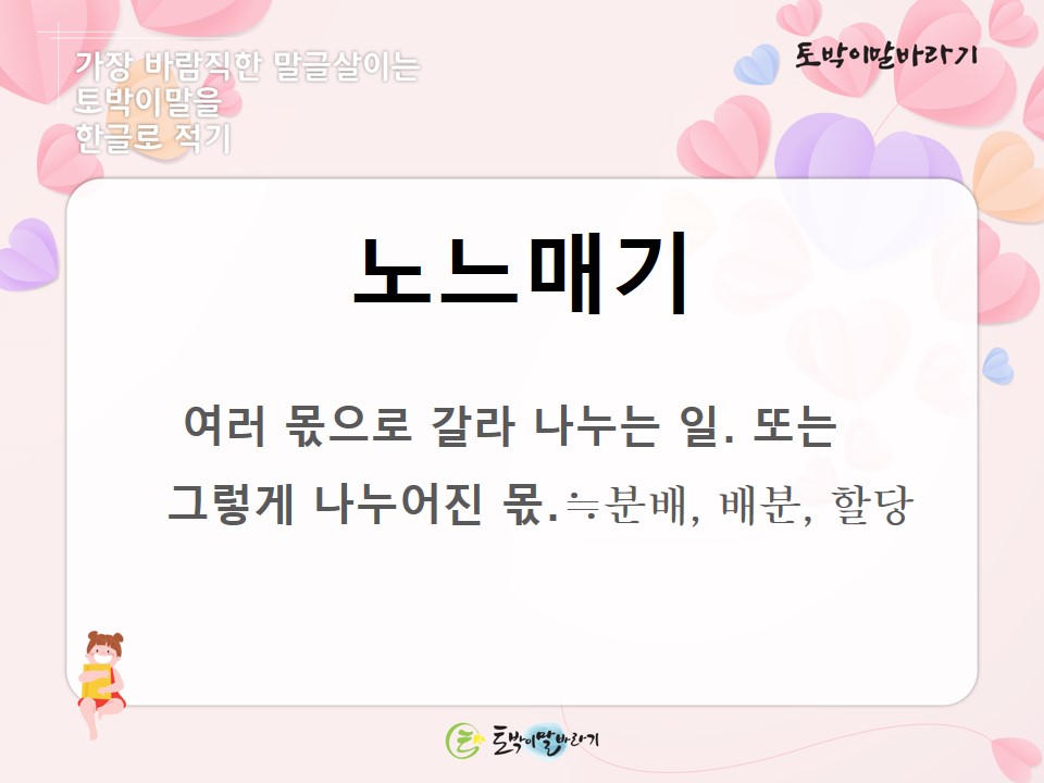앞으로 '배분', '분배', '할당'이라는 말을 써야 할 일이 있을 때 '노느매기'라는 토박이말을 떠올려 써 보시기 바랍니다. 오늘도 토박이말에 마음을 써 봐 주시고 좋아해 주시며 둘레 사람들께 나눠 주시는 여러분 모두 고맙습니다.