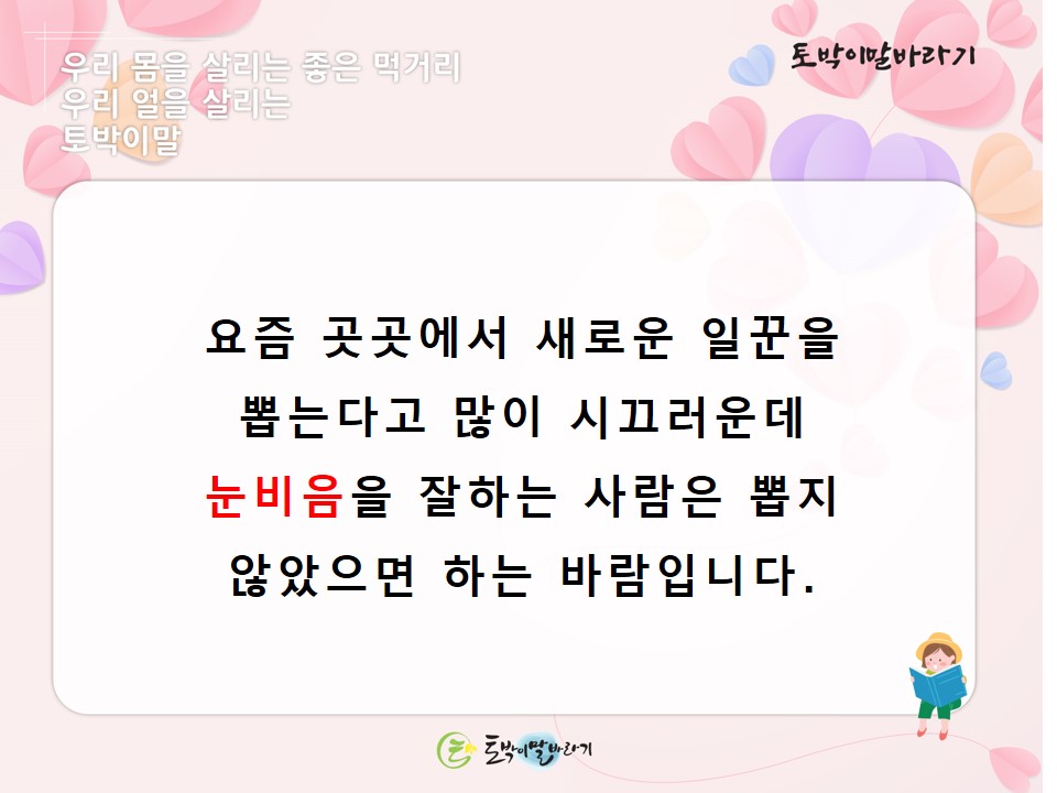 요즘 곳곳에서 새로운 일꾼을 뽑는다고 많이 시끄러운데 눈비음을 잘하는 사람은 뽑지 않았으면 하는 바람입니다. 오늘도 토박이말에 마음을 써 봐 주시고 좋아해 주시며 둘레 사람들께 나눠 주시는 여러분 모두 고맙습니다.