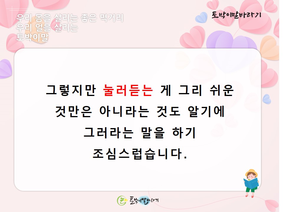 오늘도 토박이말에 마음을 써 봐 주시고 좋아해 주시며 둘레 사람들께 나눠 주시는 여러분 모두 고맙습니다. 토박이말 지킴이요 가꿈이시신 여러분들이 자랑스럽습니다. ^^