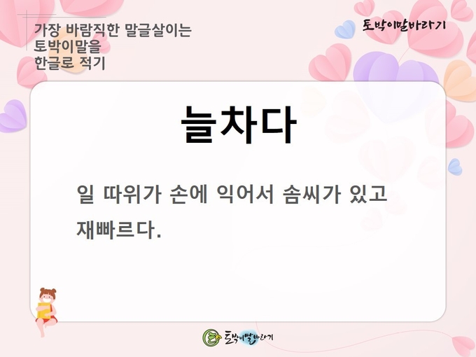 오늘 알려 드릴 토박이말은 '늘차다'입니다. 이 말을 두고 말집(사전) 가운데 표준국어대사전에서는 '능란하고 재빠르다'라고 풀이를 하고 '늘찬 일솜씨'를 보기로 들었습니다. 고려대 한국어대사전에서는 ' (솜씨가) 아주 익숙하고 재빠르다'고 풀이를 해 놓고 "김 씨는 일솜씨가 늘차서 다른 사람들보다 몇 배의 일을 금세 해 버리더라고."를 보기월로 들었습니다.