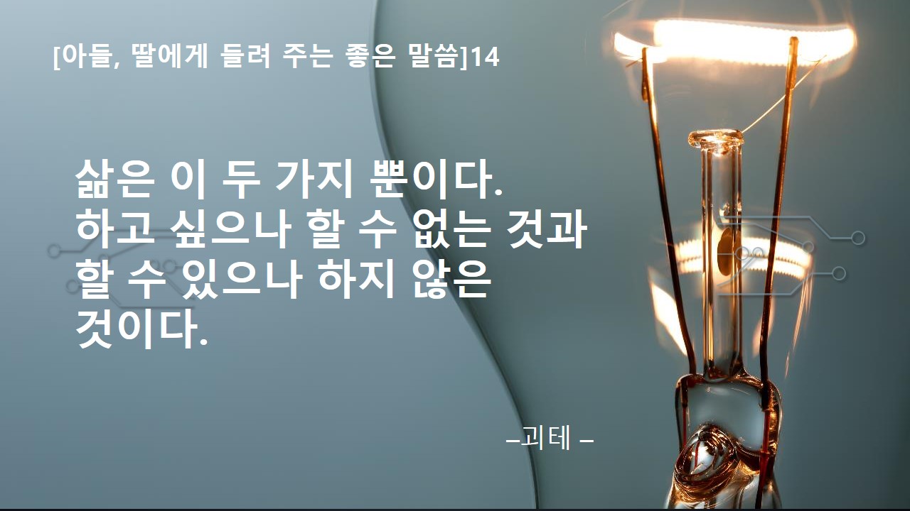 오늘 들려 줄 좋은 말씀은 "삶은 이 두 가지 뿐이다. 하고 싶으나 할 수 없는 것과 할 수 있으나 하지 않는 것이다."야. 이 말씀은 앞서 알려 준 좋은 말씀과 이어지는 말인데 너희들도 잘 아는 '괴테' 님이 남기신 말이라고 해.