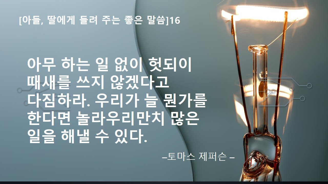 오늘 알려 줄 좋은 말씀은 "아무 하는 일 없이 헛되이 때새를 쓰지 않겠다고 다짐하라. 우리가 늘 뭔가를 한다면 놀라우리만치 많은 일을 해 낼 수 있다."야 이 말씀은 미국 독립선언문을 쓴 '토마스 제퍼슨' 님의 말씀이라고 해. 내가 늘 하는 이야기와도 이어지는 말이라 반갑기도 했어.