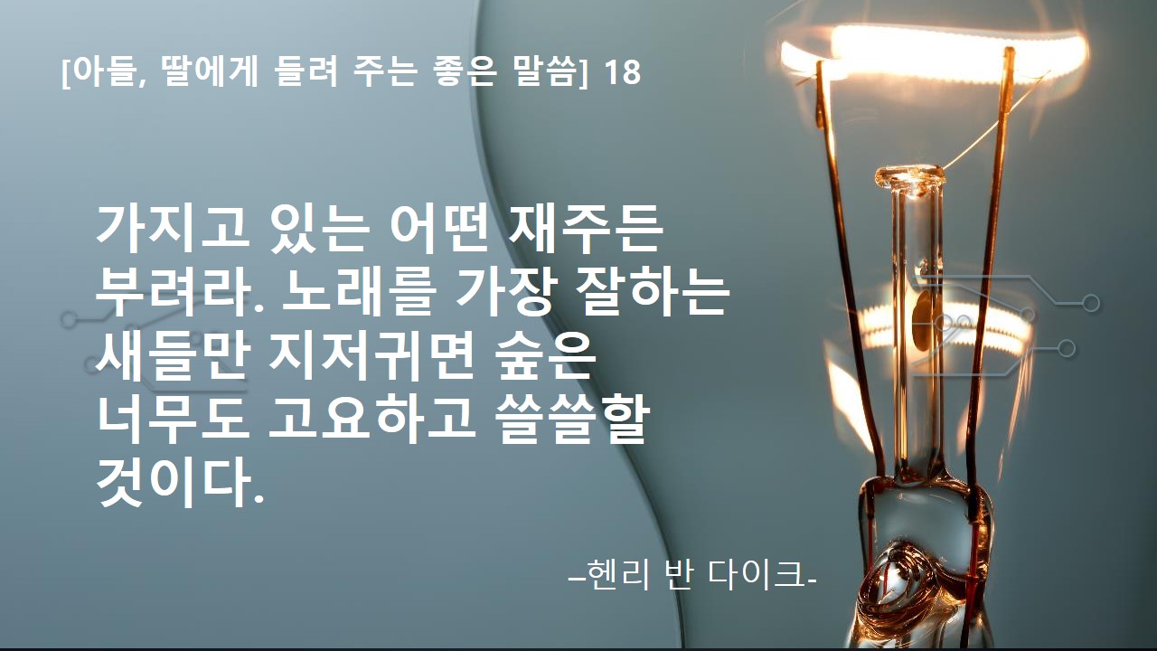 오늘 들려 줄 좋은 말씀은 "가지고 있는 어떤 재주든 부려라. 노래를 가장 잘하는 새들만 지저귀면 숲은 너무도 고요하고 쓸쓸할 것이다."야. 이 말은 미국의 영문학 교수였던 헨리 반 다이크 님이 하신 말씀이라고 하는구나.
