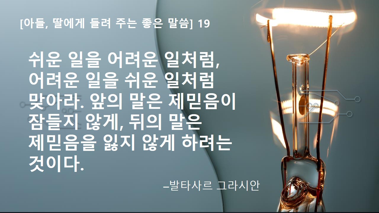 오늘 알려 줄 좋은 말씀은 "쉬운 일을 어려운 일처럼, 어려운 일을 쉬운 일처럼 맞아라. 앞의 말은 제믿음이 잠들지 않게, 뒤의 말은 제믿음을 잃지 않게 하려는 것이다."야. 이 말씀은 스페인 예수회 사제이자 신학교수였던 발타사르 그라시안 님께서 남기신 거라고 하는구나. 흔히 말하는 '자신감'을 갖고 살라는 뜻을 담은 좋은 말씀 가운데 으뜸이 아닐까 싶은 생각이 드는 말이지.
