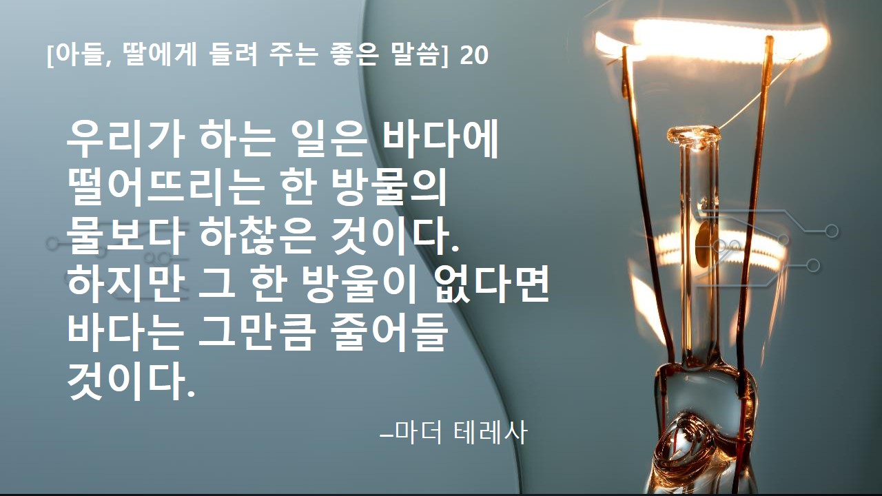 오늘 들려 줄 좋은 말씀은 "우리가 하는 일은 바다에 떨어뜨리는 한 방울의 물보다 하찮은 것이다. 하지만 그 한 방울이 없다면 바다는 그만큼 줄어들 것이다."야. 이 말씀은 사랑의 고수련(간호)으로 온 누리 사람들에게 널리 알려져 있는 마더 테레사 님께서 남기신 말씀이야. '테레사 수녀님'이라고 부르는 사람들이 많기 때문에 너희들도 그렇게 알고 있을 수도 있겠구나.