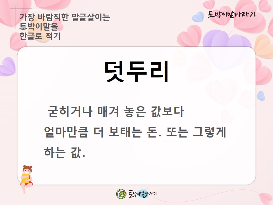 오늘 알려 드릴 토박이말은 '덧두리'입니다. 이 말은 표준국어대사전에서는 '1. 정해 놓은 액수 외에 얼마만큼 더 보탬. 또는 그렇게 하는 값'으로 풀이를 하고 있습니다. '고려대한국어대사전'에는 '1. 정해 놓은 액수 외에 얼마만큼 더 보태는 돈'이라고 풀이를 해 놓았습니다. 둘이 풀이해 놓은 것이 거의 비슷한데 우리가 잘 알고 있는 '웃돈'과 가까운 말임을 알 수 있습니다. 그래서 저는 다음과 같이 풀이를 해 보았습니다.