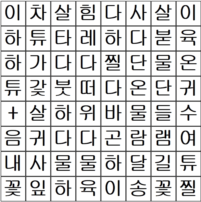 그런 말음을 담아 토박이말 찾기 놀이를 만들어 봅니다. 오늘은 토박이말 살리기 42-45까지 낱말과 옛날 배움책에서 캐낸 토박이말, 노래에서 길을 찾다에 나온 토박이말을 보태서 만들었습니다. 첫소리 실마리만 알려 드리고 뜻은 밑에 낱말과 함께 알려드리겠습니다. 지난 찾기 놀이 때처럼 낱말을 다 찾으시면 빛깔을 입혀 찍은 다음 글갚음(댓글)으로 달아 주시면 고맙겠습니다.