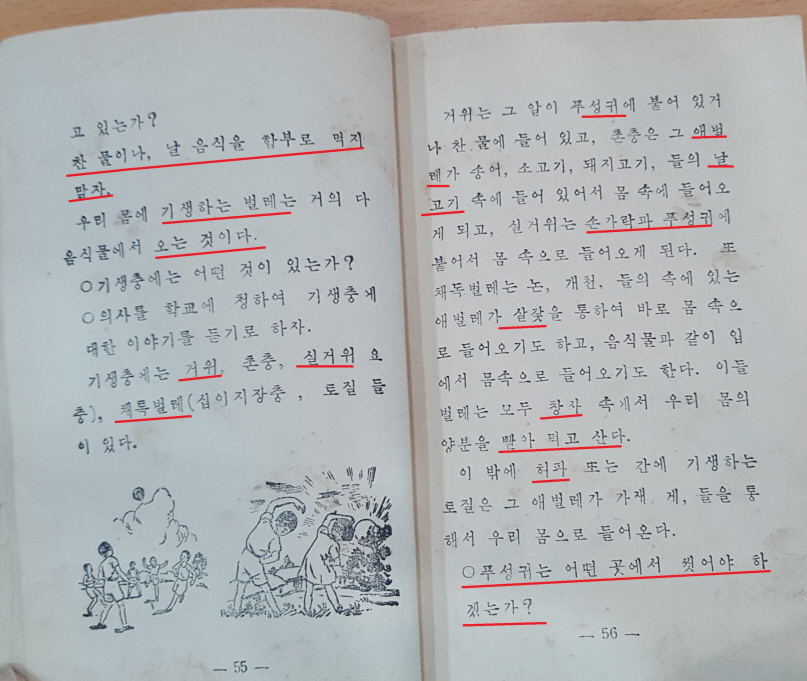 55쪽 둘째 줄에 있는 “찬물이나 날 음식을 함부로 먹지 말자.”에서 ‘음식’을 빼면 모두 토박이말로 되어 있습니다. 여기 나온 ‘날-’은 오늘날에 살려 쓰면 좋겠다는 생각이 듭니다. 우리가 ‘고기’를 이야기할 때 ‘생고기’라는 말을 많이 쓰는데 이 말은 ‘날고기’라는 뜻이니까 ‘날고기’라고 하면 될 것입니다. 56쪽에도 ‘날고기’라는 말이 나올 만큼 옛날에는 두루 썼다는 것을 알 수 있습니다.