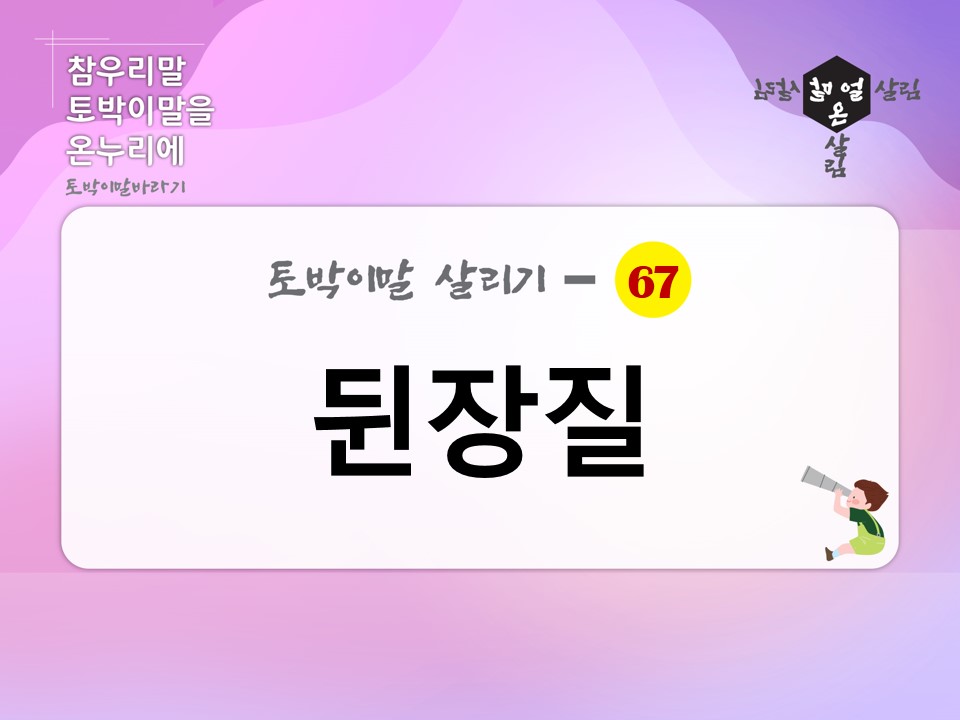 오늘 알려 드릴 토박이말은 '뒨장질'입니다. 이 말을 표준국어대사전에서는 '사람이나 짐승, 물건 따위를 뒤져내는 일을 낮잡아 이르는 말'이라고 풀이를 하고 있습니다. 그리고 "형방 비장이 나장이 팔구 명을 데리고 대들어서 도화와 도화의 집 사람을 한옆에 몰아 놓고 뒨장질을 시작하여 온 집 안을 샅샅이 뒤졌으나 장물 잡아낼 것이 별로 없었다."는 홍명희의 임꺽정에 있는 보기월을 보기로 들었습니다. 그 다음 '닥치는 대로 들었다 놓았다 하는 일을 낮잡아 이르는 말'이라는 뜻도 있다고 풀이를 해 놓았습니다.