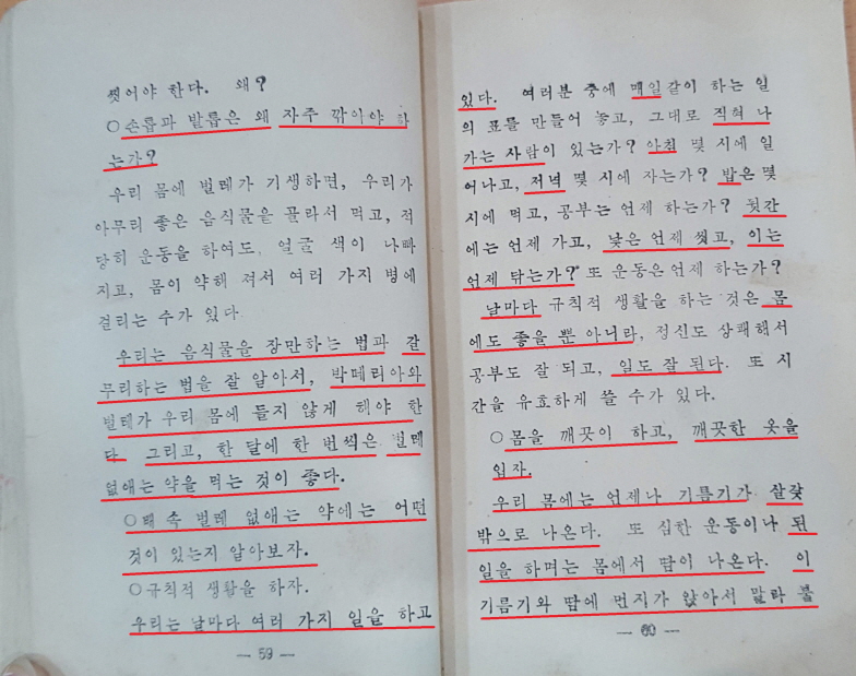 열둘째 줄과 열셋째 줄에 걸쳐 나온 “몸을 깨끗이 하고, 깨끗한 옷을 입자.”도 모두 토박이말로 된 월입니다. 그 다음 월인 “우리 몸에는 언제나 기름기가 살갗 밖으로 나온다.”도 ‘기름기’의 ‘-기(氣)’만 빼면 모두 토박이말로 되어 있습니다. 여기서 나온 ‘기름’은 ‘지방’을, ‘살갗’은 ‘피부’를 가리키는 토박이말이라는 것도 앞서 나왔기 때문에 잘 아실 거라 믿습니다.