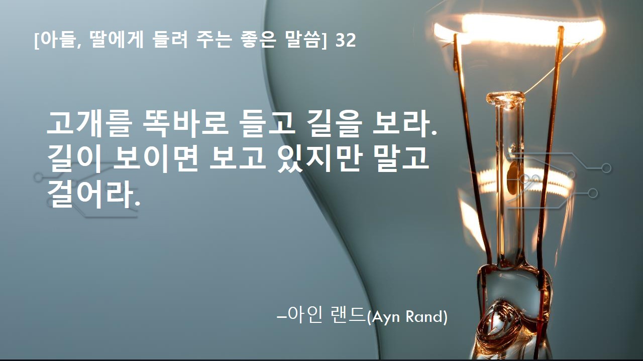 오늘 들려 줄 좋은 말씀은 "고개를 똑바로 들고 길을 보라. 길이 보이면 보고 있지만 말고 걸어라."야. 이 말은 미국에서 이름난 지은이(소설, 극, 시나리오)이자 슬기맑힘이(철학자)인 아인 랜드 님이 남긴 말씀이라고 하는데 무슨 일이든 첫걸음을 떼어 놓는 일이 얼마나 종요로운 것인지를 일깨워 주는 말씀이지 싶어.