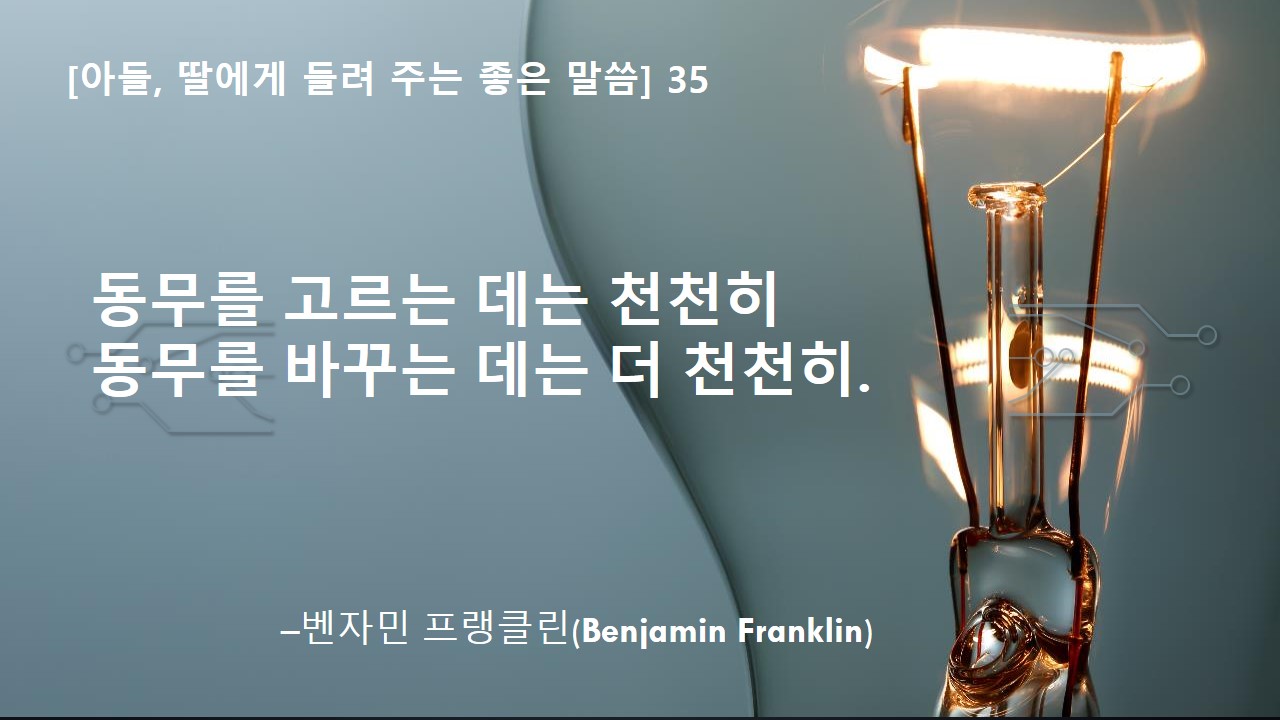 오늘 들려 줄 좋은 말씀은 "동무를 고르는 데는 천천히, 동무를 바꾸는 데는 더 천천히."야. 이 말씀은 앞서 다른 말씀을 하신 분으로 알려 드린 적이 있는 벤자민 프랭클린 님께서 남기신 말씀이란다. 워낙 널리 알려 지신 분이고 좋은 말씀을 많이 남기신 분이라 다음에도 또 이름을 들을 날이 오지 싶구나.