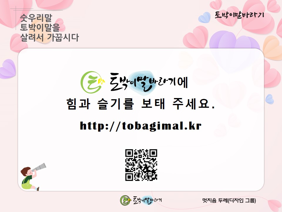 오늘도 토박이말에 마음을 써 봐 주시고 좋아해 주시며 둘레 사람들에게 나눠 주시는 여러분 모두 고맙습니다.