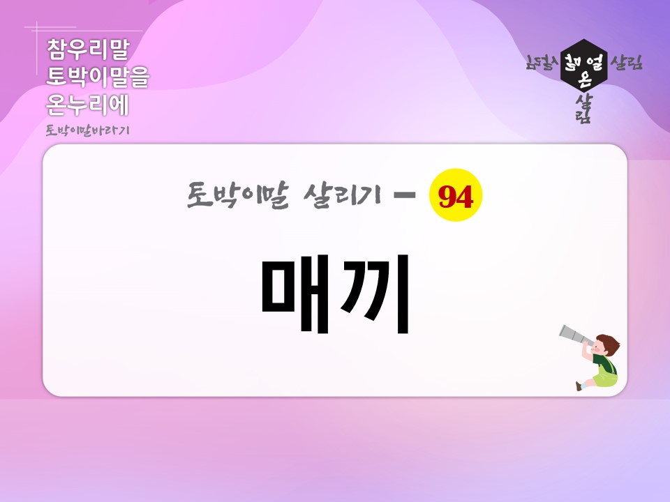 오늘 알려 드릴 토박이말은 '매끼'입니다. 이 말을 표준국어대사전에서는 두 가지 뜻으로 풀이를 하고 있습니다. 첫째 뜻은 '곡식 섬이나 곡식 단 따위를 묶을 때 쓰는 새끼나 끈'이라고 풀이를 하고 다음과 같은 보기월을 보였습니다.