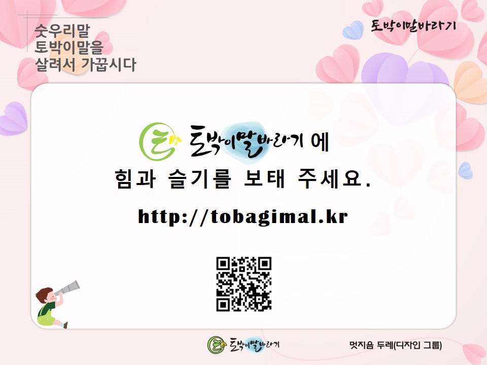 오늘도 토박이말에 마음을 써 봐 주시고 좋아해 주시며 둘레 사람들에게 나눠 주시는 여러분 모두 고맙습니다.