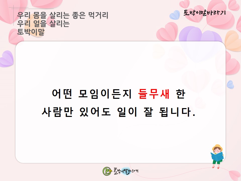 보기)어떤 모임이든지 들무새 한 사람만 있어도 일이 잘 됩니다.