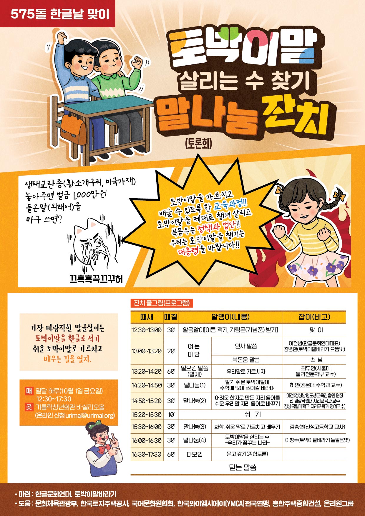 575돌 한글날을 맞아 한글문화연대(대표 이건범)와 사단법인 토박이말바라기(으뜸빛 강병환)가 함께 마련하고 문화체육관광부, 한국토지주택공사, (사)국어문화원연합회, 한국와이엠시에이(YMCA)전국연맹, 흥한주택종합건설, 온리원그룹이 도와서 ‘토박이말 살리는 수 찾기’라는 주제로 말나눔 잔치(토론회)를 엽니다.