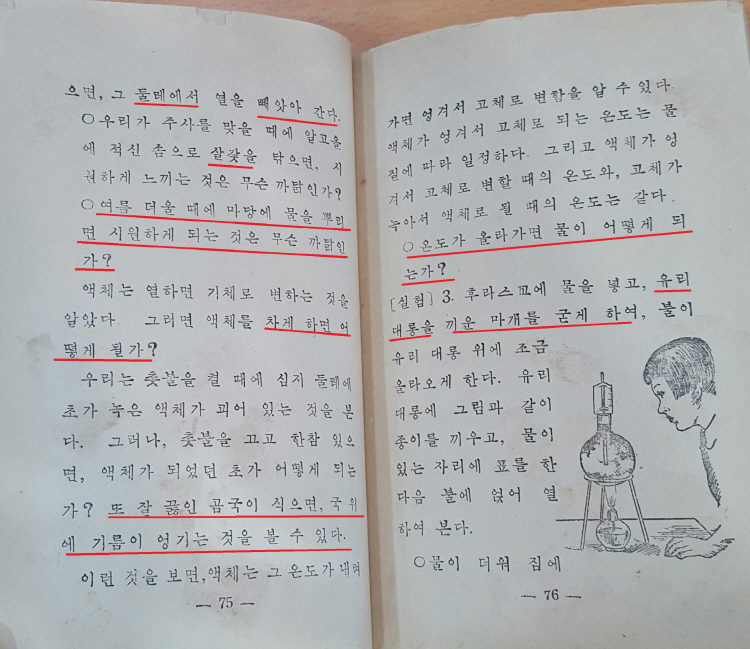 76쪽에도 엉기다가 되풀이해서 나오고 여섯째 줄과 일곱째 줄에 있는 “온도가 올라가면 물이 어떻게 되는가?”도 ‘온도’를 빼면 모두 토박이말로 되어 있습니다. 그리고 ‘온도가 올라가면’처럼 ‘상승하면’이 아닌 쉬운 말을 썼습니다.