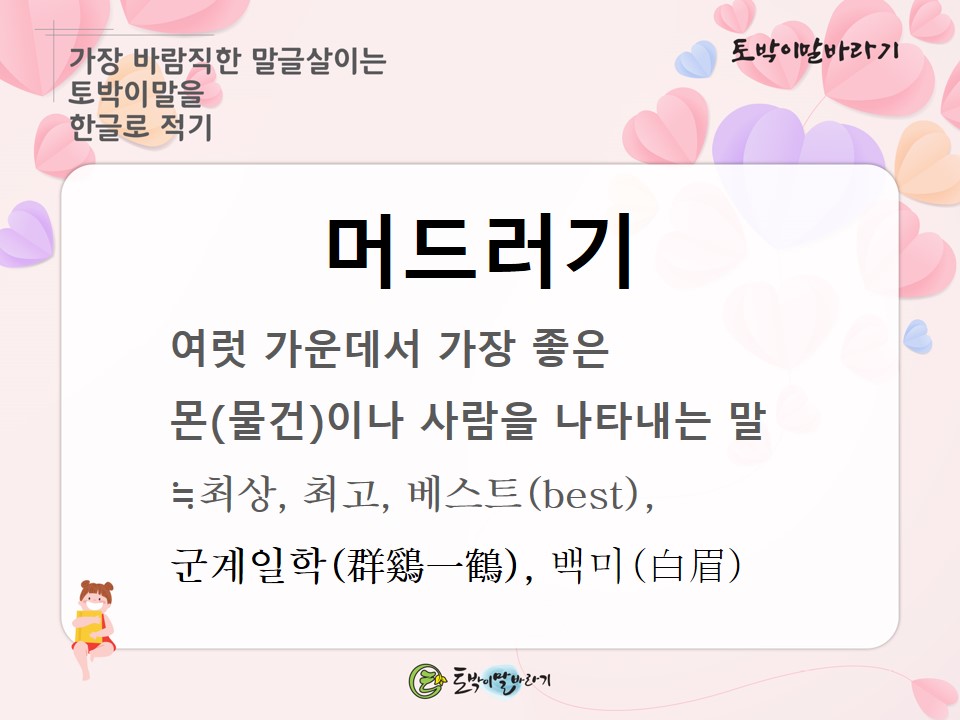 #토박이말바라기 #이창수 #토박이말 #살리기 #머드러기 #최고 #최상 #베스트 #군계일학 #백미 #숫우리말 #순우리말 #고유어